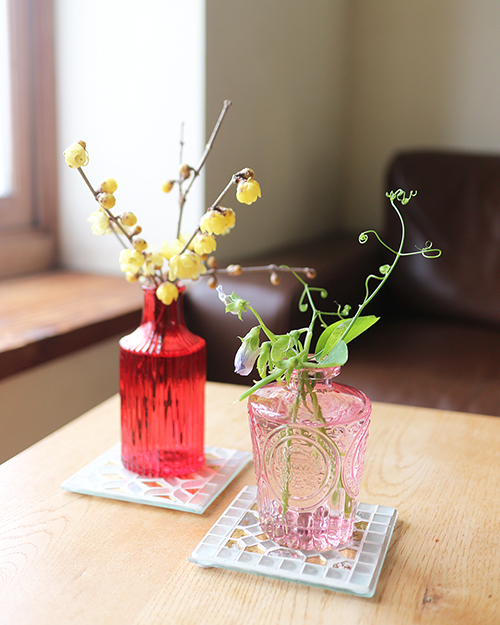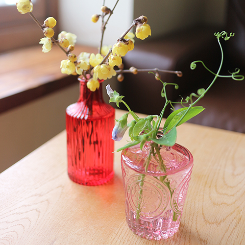 赤いガラスには黄色の蝋梅、ピンクのガラスには豆の花、シンプルに1種類を挿し二つ並べて飾ります。